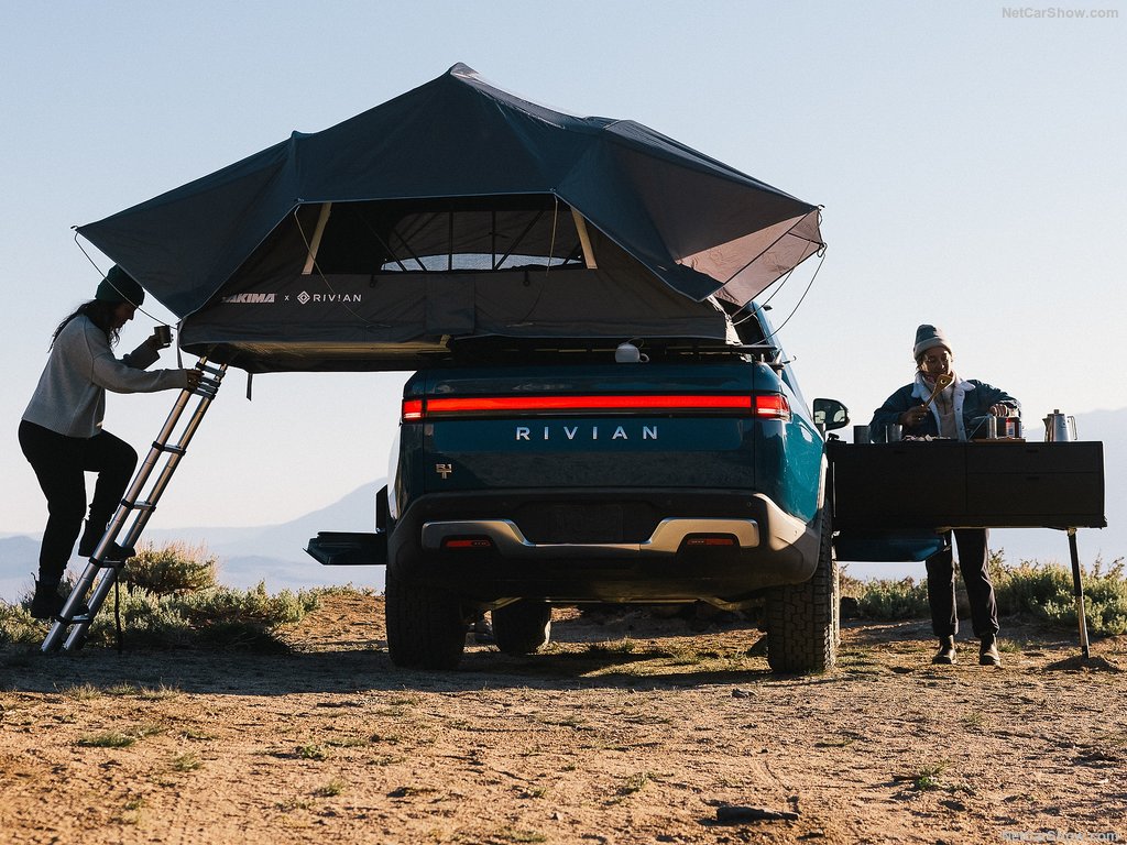 리비안 R1T의 잠금식 기어 터널 캡은 차량 전체에 걸쳐 있으며 스노우보드, 골프 가방 또는 유모차와 같은 대형 기어를 운반할 수 있는 350리터 이상의 공간을 제공합니다. 기어 터널 문은 등산화를 묶는 것과 같은 좌석뿐만 아니라 침대 또는 지붕에 물건을 싣는 단계의 역할도 합니다. R1T에는 침대를 위한 방수 통합 토노 커버가 있으며 침대 바닥 아래에는 200리터의 밀봉된 통이 있어 일반 크기의 예비 타이어를 보관하는 데에도 사용할 수 있습니다. 침대에는 3개의 110볼트 콘센트와 통합 압축 공기가 있습니다.